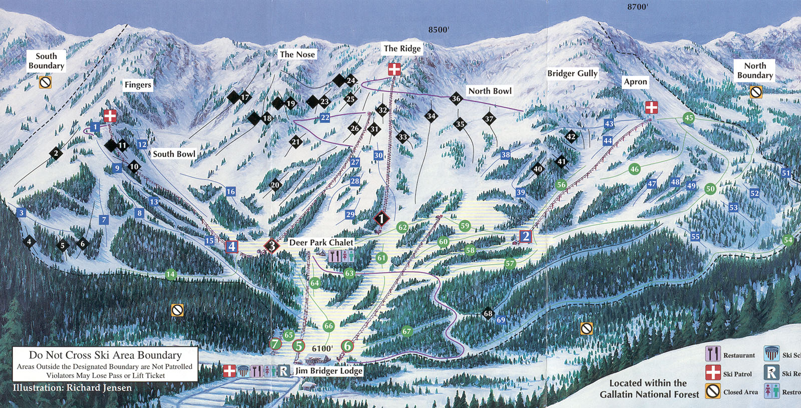 Bridger Bowl is primarily a community ski area that also caters to destination travelers. Bozeman serves as the main bed base with most of the lodging and entertainment options. There are many excellent restaurants, shops, galleries, microbreweries and bars in the town and the community supports a strong cultural presence with a wide variety of music available ranging from country to jazz. Yellowstone National Park is only 90 miles from Bozeman.