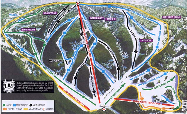 The grooming is top notch and the tree skiing some of the best in the Northwest. Because Bluewood is located in a heavily timbered north-facing bowl, it gets good snow and holds it.